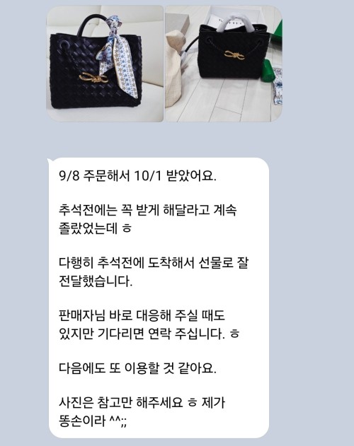 9/8 주문해서 10/1 받았어요. 추석전에는 꼭 받게 해달라고 계속 졸랐었는데 ㅎ 다행히 추석전에 도착해서 선물로 잘 전달했습니다. 판매자님 바로 대응해 주실 때도 있지만 기다리면 연락 주십니다. ㅎ 다음에도 또 이용할 것 같아요. 사진은 참고만 해주세요 ㅎ 제가 똥손이라 ^^;;